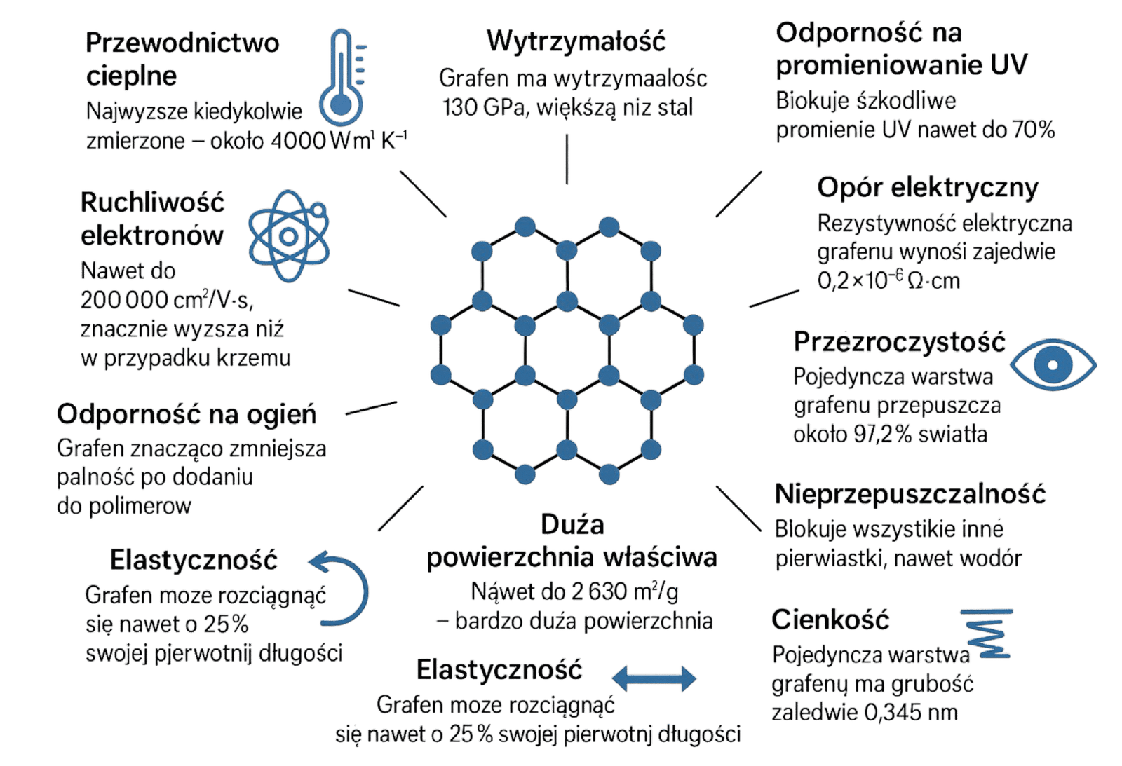 - W temperaturze pokojowej elektrony grafenu wykazują bardzo dużą ruchliwość. Prędkość przepływu elektronów wynosi nawet 1/300 prędkości światła.